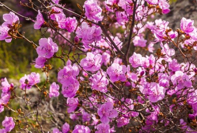Der halb immergrüne Ledebour, auch bekannt als Maralnik, hält Temperaturen von nur 30 ° C stand. Diese Funktion ermöglicht es ihm, sich auch im kühlen Klima der Region Moskau wohl zu fühlen und sich nach dem Winter schnell zu erholen. Dieser Rhododendron wächst bis zu 1,5 - 2 m und die Blütezeit wird manchmal zweimal pro Saison wiederholt - Ende Mai und Anfang September. Zu diesem Zeitpunkt erscheinen auf den Zweigen mit kleinen glänzenden Blättern razemose Blütenstände mit rosa glockenförmigen Blüten von bis zu 5 cm Durchmesser.