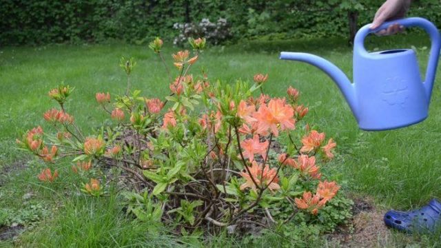 Im Klima der Region Moskau lohnt es sich besonders, Rhododendren aller Art zu gießen. Diese Pflanzen sind aufgrund ihres tropischen Ursprungs sehr hygrophil. Daher sollten sie während der Knospungszeit 8 bis 10 Mal im Monat in kleinen Portionen mit Regen oder abgesetztem Wasser versorgt werden, damit die Feuchtigkeit den Boden ständig um 20 bis 25 cm durchnässt , stagniert aber nicht. Ein Flüssigkeitsüberschuss sowie sein Mangel an Flüssigkeit können für jede Art von Rhododendron tödlich sein. Daher lohnt es sich, das Bewässerungsregime für Pflanzen anzupassen und sich auf die für die Region Moskau typischen Niederschläge zu konzentrieren. Trotz der Wetterbedingungen hören alle Sorten Mitte August auf zu gießen, um das aktive Wachstum der Sträucher zu stoppen und sie auf den Winter vorzubereiten.