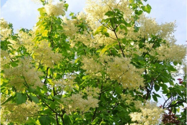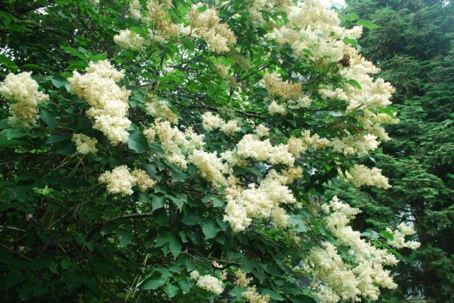 Amur-Flieder produziert große, breit geschmolzene Blütenstände. Sie erreichen eine Länge von 25 cm und einen Umfang von 20 cm. Die Blüten sind klein, 5 - 6 mm im Durchmesser, mit einem starken Aroma, weiß oder cremefarben. Die Blütenstände blühen Ende Juni - Anfang Juli.