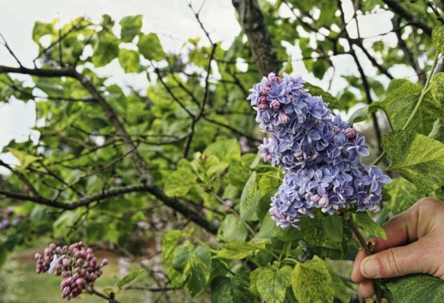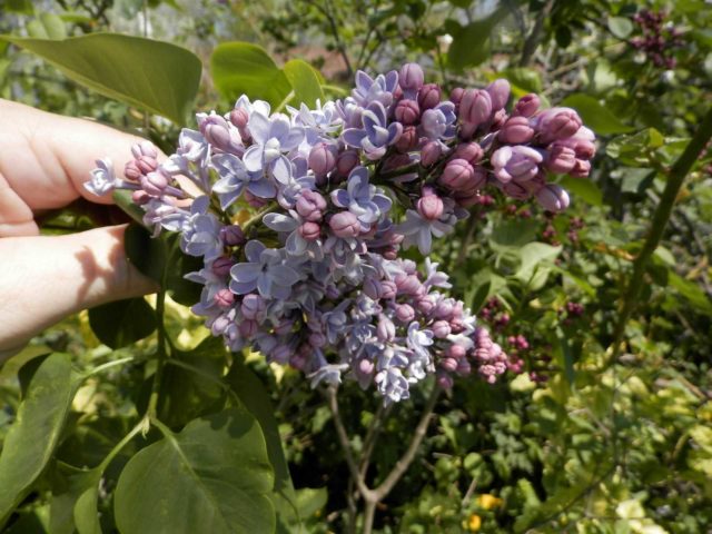Die Blüten der Sorte Aucubafolia sind hellblau mit einer lila Tönung, halbgefüllt. Sie werden in großen, lockeren, panikförmigen Blütenständen gesammelt, deren Länge durchschnittlich 20 bis 25 cm erreicht. Flieder blüht extrem reichlich.