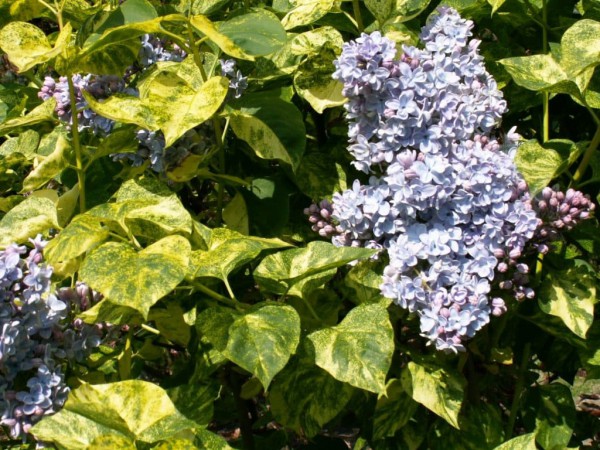 Flieder gemeinsame Aucubafolia (Aucubaefolia) gehört zur Anzahl der aufrechten hohen Sorten - die Büsche wachsen unter günstigen Wachstumsbedingungen bis zu 2,5-3 m. Besonderheiten der Sorte Aucubafolia: breite Krone, reiches Blütenaroma und buntes Laub. Diese Farbe der Blattplatte bildete die Grundlage für den Namen der Sorte - grüne Blätter mit hellgelben Streifen und Flecken ähneln Aucuba-Laub.