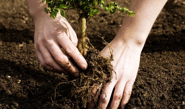- Der Sämling wird vorsichtig in das Loch abgesenkt und die Wurzeln der Pflanze werden ausgebreitet.