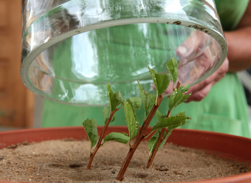 - Der untere Schnitt wird mit einem Wurzelwachstumsstimulator behandelt, wonach die Stecklinge in Behälter gepflanzt werden.