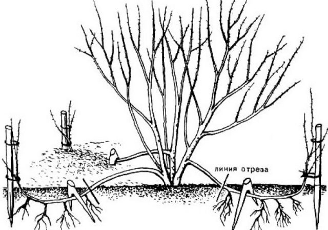 - Halbverholzte Zweige des laufenden Jahres werden am Busch ausgewählt und näher am Boden geschnitten.