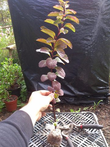 - Strauch 1,5 m hoch, gibt eine erhebliche Anzahl von aufrechten Prozessen. Die Struktur des Stiels ist zäh, stark, flexibel, hellbraun mit einem burgunderfarbenen Farbton. Zweige mit dichter Kante.