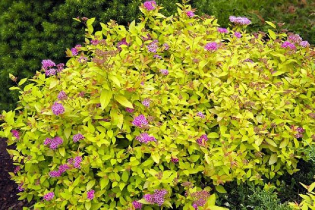 Spirea dieser Art ist sehr dekorativ und daher bei Landschaftsarchitekten beliebt. Die Abmessungen des Spirea-Busches der Goldenen Prinzessin passen perfekt zu verschiedenen Kompositionen. Mit Hilfe von Mädesüß können Sie einen niedrigen Rand, eine Kante, eine Mischgrenze aus verschiedenen Arten ähnlicher Sträucher erstellen und einem felsigen Garten Farben hinzufügen. Die Pflanze wird mit mehrjährigen Kräutern und Blüten kombiniert. Ideal für saisonale Kompositionen. Darüber hinaus hat die japanische Art die längste Blüte unter ihren Gegenstücken. 45 Tage lang ist der Garten mit bunten Sträuchern gefüllt.