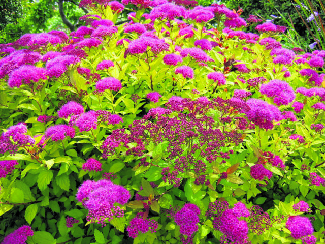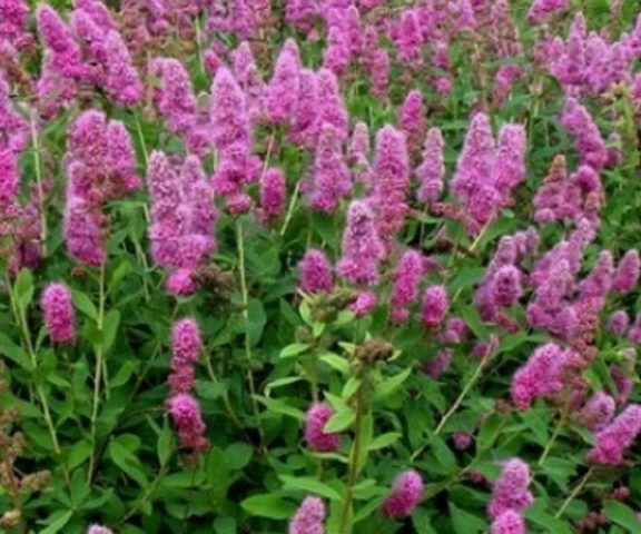 Der Strauch wird für seine leuchtend rosa Blüte geschätzt. Es gibt auch lila, Granatapfel, Burgunder Schattierungen von Blütenständen. Selten wird aber weiße Spirea gefunden.