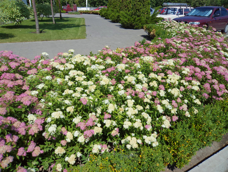Aufgrund seiner Unprätentiösität und Frostbeständigkeit wird Spirea aktiv verwendet, um Gärten und Parks praktisch in ganz Russland vom europäischen Teil über den Fernen Osten und im Norden bis zu den Polarregionen zu dekorieren.In besonders kalten Wintern kann der oberirdische, gut verwurzelte Teil der Pflanzen gefrieren, im Sommer wächst er jedoch nach und blüht sogar.