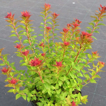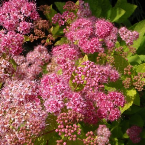 Anthony Vaterer ist einer der beeindruckendsten Blütenstände japanischer Spirea-Sorten. Die Blütenstände können einen Durchmesser von 15 cm erreichen und haben eine hellrote Farbe.