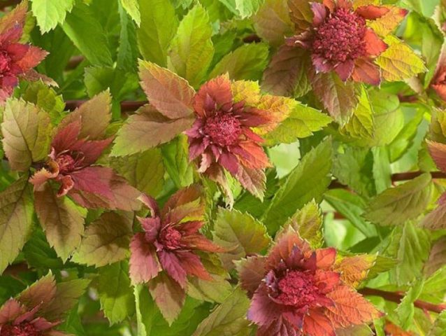 Ziemlich hohe Sträucher mit einer Höhe von 90-100 cm und einer Breite von gleicher Größe. Die Sorte zeichnet sich durch hochdekoratives Laub aus, das sich wie üblich dreimal im Jahr ändert, sich aber im Herbst lila-violett verfärbt. Helle, dunkelrosa Blüten blühen vom Beginn des Sommers an und können sich bis zum Herbst bilden, wenn die verblassten Blütenstände entfernt werden. - Doppelspiel Urknall
