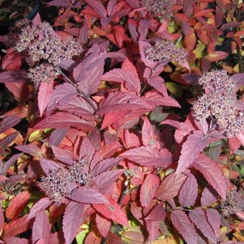 Eine weitere ziemlich große Sorte von Spirea, die eine Höhe von 1 Meter erreicht. Am Beispiel eines Fotos seiner Blätter mit Trieben können Sie deutlich sehen, wie sich der Farbton ihrer violetten Farbe von Frühling zu Herbst ändert.