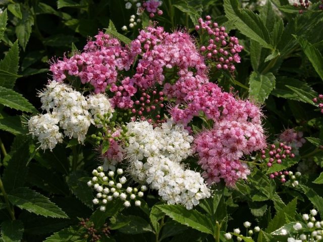 Diese Sorte japanischer Spirea, eine der interessantesten in Bezug auf Farbblütenstände, wird auch als Shirobana oder dreifarbige Spirea bezeichnet.