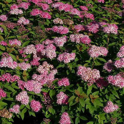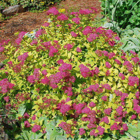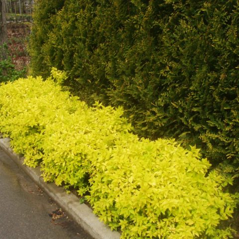 Spirea-Sorte mit einer einzigartigen Laubfarbe, in der es keine Grüntöne gibt. Im Frühjahr sind die Blätter orange, im Sommer sind sie in verschiedenen gelblichen Tönen gefärbt, um im Herbst rot-orange zu werden. Die Blüte dieser Sträucher, die von Juni bis August dauern kann, ist nicht weniger interessant. Die Blüten selbst sind groß und rosa. Spireas dieser Sorte erreichen eine Höhe von 80 cm bei einem Kronendurchmesser von bis zu 100 cm. - Doppelspiel Gold