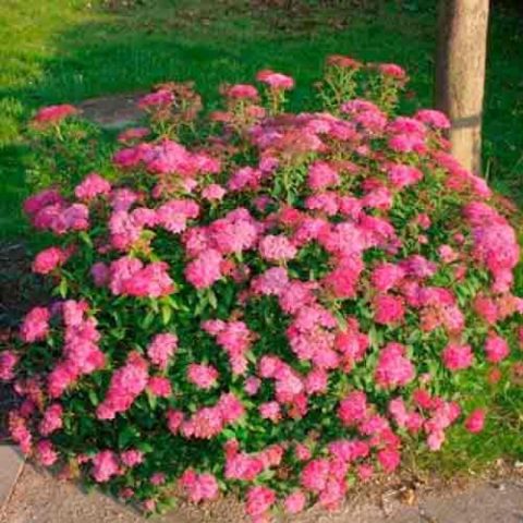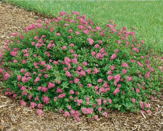 Eine weitere bemerkenswerte Sorte von Spirea, der Triebe mit grünen Blättern fehlen. In Bezug auf die Größe kann es bereits den Zwergsorten der japanischen Spirea zugeschrieben werden, da die Büsche nicht höher als 50 cm wachsen. In der Breite wachsen sie jedoch auf 50-60 cm.