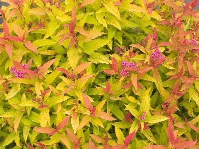 Eine der beliebtesten Sorten japanischer Spirea unter Gärtnern, deren Blätter an den Trieben nicht grün, sondern gelb sind. Im Sommer verblasst die Gelbtönung leicht und wird grünlich, im Herbst nimmt sie jedoch eine ausgeprägte rosa Farbe an.