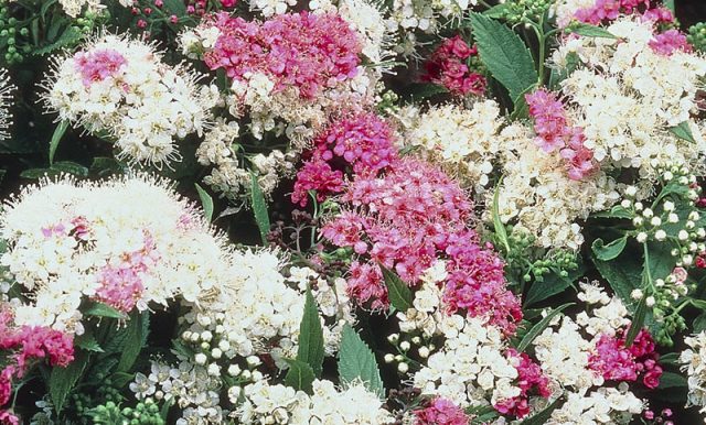 Die Farbe der Blüten der Shiroban-Spirea variiert von Weiß bis zu blassrosa Tönen. Diese Sorte blüht den ganzen Sommer über.