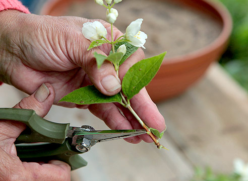 Das Beschneiden ist ein Muss für Minnesota Snowflake Jasmin. Mit einer richtig geformten Krone der Scheinorange, die frei von beschädigten und "im Busch" wachsenden Zweigen ist, bildet sie Blüten mit größerem Durchmesser und in größerer Anzahl.