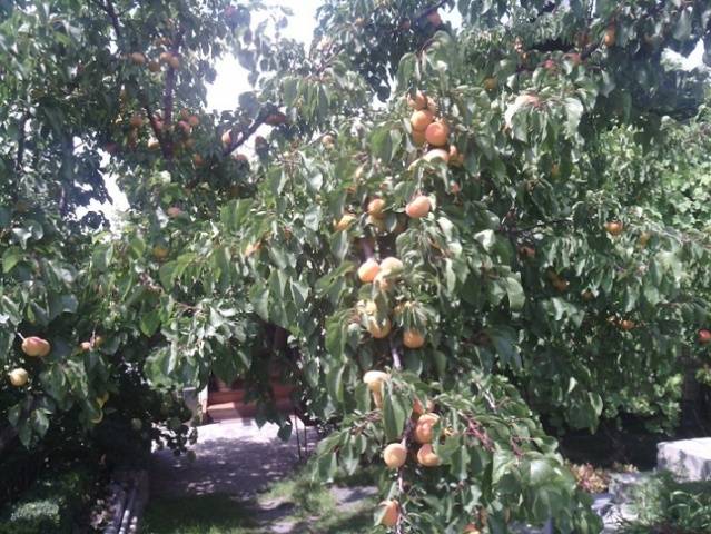 Aprikose Chabarowsk ist ein ziemlich hoher Baum, im Alter von zehn Jahren erreicht er eine Höhe von 4,5 bis 5,0 Metern, der Kronenumfang beträgt 5 Meter oder mehr. Die Krone selbst breitet sich aus, nicht verdickt, auf dunkelvioletten dicken und geraden Ästen gibt es weißliche längliche Streifen. Das jährliche Wachstum ist stark und gerade, ihre Länge kann 1 Meter erreichen (bei jungen 3-4 Jahre alten Bäumen). Früchte werden auf Fruchtzweigen auf Holz gebildet, die 2-3 Jahre alt sind.