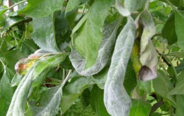 Im Anfangsstadium kann die Krankheit durch eine weiße Beschichtung identifiziert werden, die leicht mit einem Finger entfernt werden kann. Ohne Behandlung vergröbert sich die Blattplatte und wird braun. Wenn die Krankheit den Baum während der Fruchtbildung angreift, knacken die Früchte und wachsen deformiert. Wenn Sie die Behandlung nicht rechtzeitig beginnen, erscheint auf den Pfirsichen eine schwarze Blüte, die verrottet und zerbröckelt.