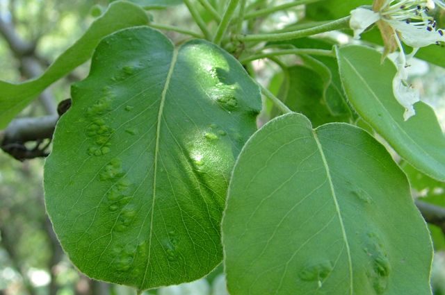 - Zunächst bilden sich an den Schadensstellen hellgrüne Plaques mit einem Durchmesser von bis zu 3 mm, die sich an der Unterseite des Birnenblattes entlang der Mittelader befinden.