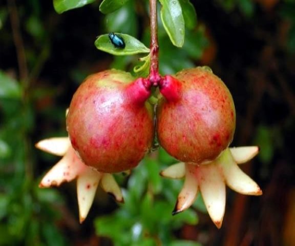 Die Granatapfelblüte hat eine harte Blütenhülle, die die zarten Blütenblätter im Inneren bedeckt. Während der Saison erscheinen viele glockenähnliche asexuelle Blüten am Baum. Fruchtblumen sehen aus wie kleine Seerosen. Ein Baum unter guten Haltbarkeitsbedingungen trägt Früchte von 7 bis 20 Jahren.
