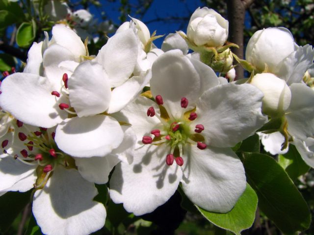 Die Blüten von Heras Birne sind weiß mit weißen Blütenblättern. Der Knospungs- und Öffnungsprozess findet am Ende des Frühlings statt. Blumen mit einem Durchmesser von bis zu 3 cm bedecken den Stamm fast vollständig.