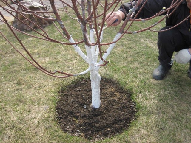 Wenn es im Herbst nicht möglich ist, muss es im Februar durchgeführt werden, um das Auftreten von Rissen in der Rinde infolge von Nachtfrösten zu verhindern.