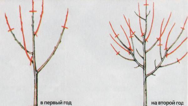 Auf einem zwei Jahre alten Apfelbaum wachsen im Sommer mehrere Seitentriebe am Hauptstamm. Wenn einige von ihnen im Herbst nicht ausgeschnitten werden, wird die Krone verdickt. Es reicht aus, 3 bis 5 Äste zu lassen, die sich durch ihre Stärke auszeichnen und im Verhältnis zum Hauptstamm rechtwinklig wachsen. Der Rest muss nicht bereut werden, sie müssen im Herbst entfernt werden.