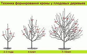 Wenn Sie gebrochene Zweige oder Risse in der Rinde junger Bäume bemerken, müssen Sie mit der Desinfektion beginnen. Die Rinde wird sorgfältig mit einem Spatel geschützt und die Zweige werden mit einer Gartenschere geschnitten oder geschnitten. - Danach beginnen sie die Krone zu bilden. Es wird auf verschiedene Arten durchgeführt: entweder sie verdünnen oder verkürzen die Zweige. Jede der Methoden verfolgt ihre eigenen Ziele, basierend auf dem Alter des Apfelbaums. Das Schema zum Beschneiden von Äpfeln unterschiedlichen Alters im Herbst ist im Bild dargestellt.