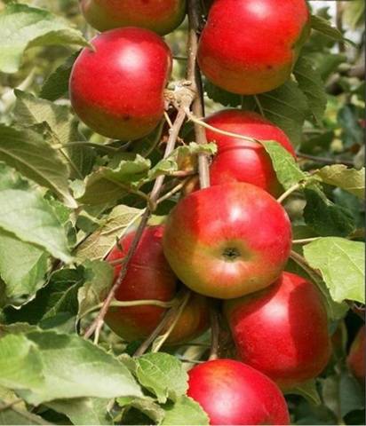 Ein weiterer Vorteil ist die jährlich reichlich vorhandene Fruchtbildung. Dieser Apfelbaum muss sich nicht "ausruhen", jedes Jahr werden sein Stamm und seine Stängel mit einer großen Menge an Früchten bedeckt. Die Äpfel sind groß, leicht abgeflacht und rosa.