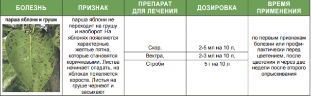 - Besprühen Sie den Apfelbaum mit Schorfmitteln mit den in der Tabelle angegebenen oder anderen geeigneten Mitteln.