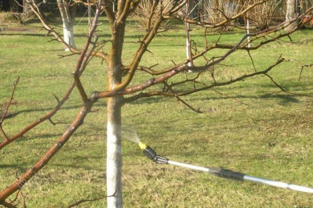 - Besprühen Sie alle Zweige und den Stamm mit einer Lösung der Bordeaux-Mischung.