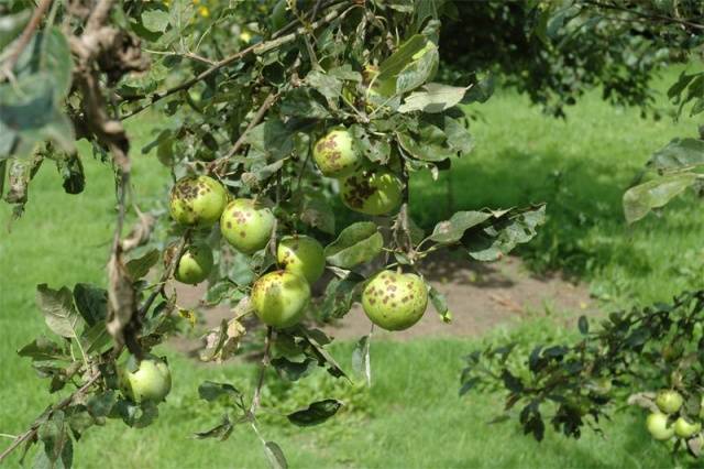 - Entfernung von mit Schorf infizierten Zweigen, Blättern und Äpfeln;