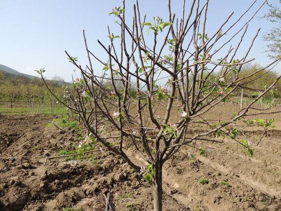 - Bereits in den ersten zwei Jahren ist es notwendig, die Anordnung der Skelettäste so anzupassen, dass die stärkeren Äste niedriger sind als die schwachen - diese Technik trägt zu einer gleichmäßigeren Entwicklung der Äste bei;
