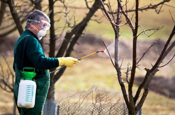 Bei trockenem, ruhigem Wetter müssen Desinfektionsmaßnahmen durchgeführt werden. Beachten Sie die Wettervorhersage - Niederschlag in den nächsten 2-3 Tagen nach der Verarbeitung ist unerwünscht. Sie werden einfach alle Ihre Arbeiten wegspülen. Denken Sie daran, Schutzmaßnahmen zu ergreifen: Tragen Sie eine Plastikbrille, eine Atemschutzmaske und Gummihandschuhe.
