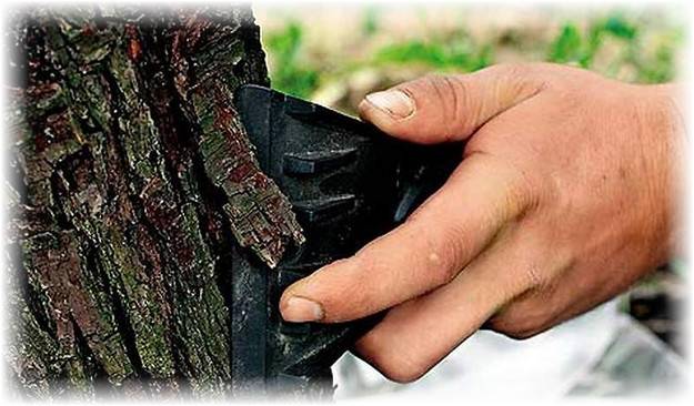 Bitte beachten Sie, dass während des Betriebs kleine Rindenstücke abfliegen können. Treffen Sie daher Schutzmaßnahmen: Tragen Sie eine spezielle Brille und Handschuhe. Untersuchen Sie den Apfelbaum auf Risse, Beschädigungen und sogar die kleinsten Löcher. Alle müssen sorgfältig gereinigt werden, wobei die leicht zu entfernende Schicht entfernt werden muss. Entfernen Sie Moos-, Flechten- und lose Rindenstücke von den Stämmen.