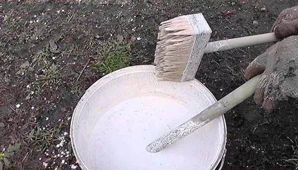 Die Lösung muss gründlich gemischt werden. 20-30 Minuten einwirken lassen und erneut mischen. Jetzt können Sie anfangen, die Apfelbäume zu tünchen.