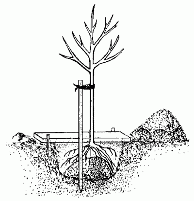 - In die Mitte des Lochs wird ein Stift gehämmert, der eine vorübergehende Stütze für den Baum darstellt.