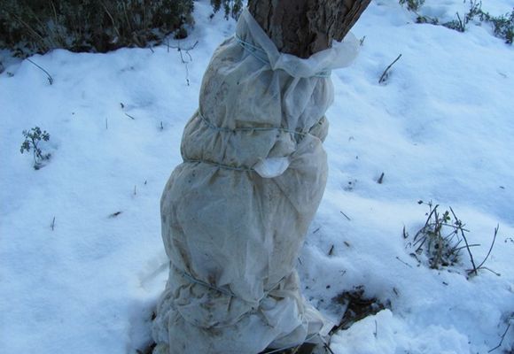 Eine Schutzschicht wird um den Stamm in Bodennähe aufgebracht und mit einem Tuch oder Seil zusammengebunden. Sie können eine Schicht Nadelisolierung mit Sackleinen oder Dachpappe umwickeln.
