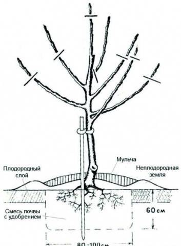 Ein Apfelbaumsämling mit offenen Wurzeln wird auf einen zuvor gegossenen Hügel fruchtbaren Bodens aus der mit Humus vermischten obersten Bodenschicht gelegt.Bewässert mit einem Eimer Wasser, bedeckt mit demselben Boden, in dessen obere Schicht Phosphor- und Kalidünger gelegt werden - 150 g pro Sämling. Sie bilden eine "Untertasse", die eine Seite aus dem Boden macht, in die ein weiterer Eimer Wasser gegossen wird. Der Boden ist mit Mulch bedeckt.
