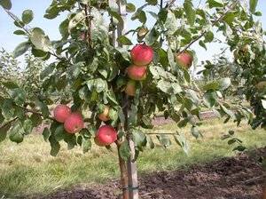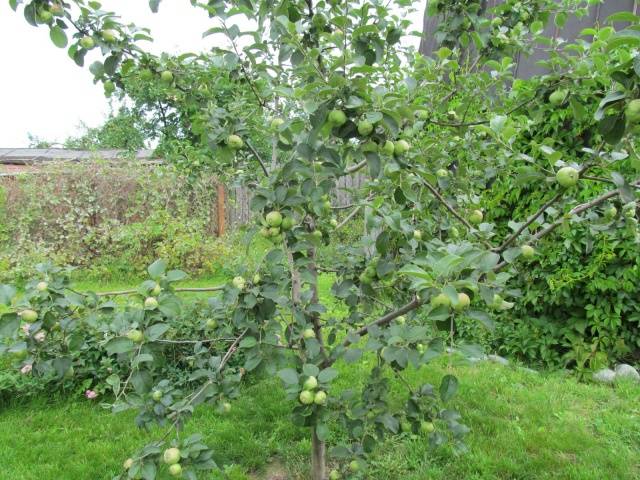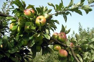Apfelbaumsorten Der Held zeichnet sich durch große Wachstumsstärke aus und erreicht eine Höhe von 4,5 m, wenn er auf einen Samenbestand gepfropft wird. Die Krone ist bis zu 6 m breit. Der Baum ist kräftig mit starken Ästen, die unteren Äste befinden sich fast parallel zum Boden. Wenn Sie einen Apfelbaum Bogatyr pflanzen auf einem ZwergwurzelstockDie Größe des Baumes wird viel kleiner sein, aber die Krone wird sich immer noch ausbreiten.