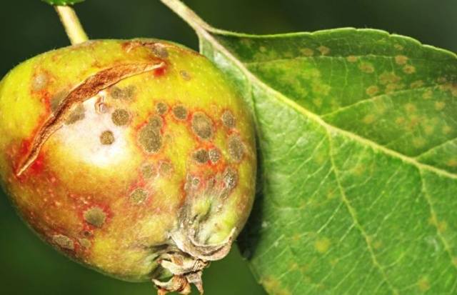 - Schorf. Das Vorhandensein einer Läsion wird durch eine braune Blüte auf den Blättern des Apfelbaums angezeigt. Die Krankheit breitet sich auf die Frucht aus, auf der graue Flecken und Risse auftreten. Zum Schutz des Apfelbaums wird mit Fungiziden Horus, Fitolavin, Fitosporin besprüht.