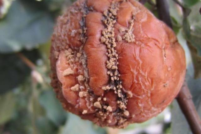 - Fruchtfäule. Die Krankheit manifestiert sich in Form von braunen Flecken, die auf der Frucht erscheinen. Das Ergebnis ist Ernteverlust. Gegen Fruchtfäule wird prophylaktisch der Apfelbaum mit Bordeaux-Flüssigkeit oder Horus-Lösung besprüht.