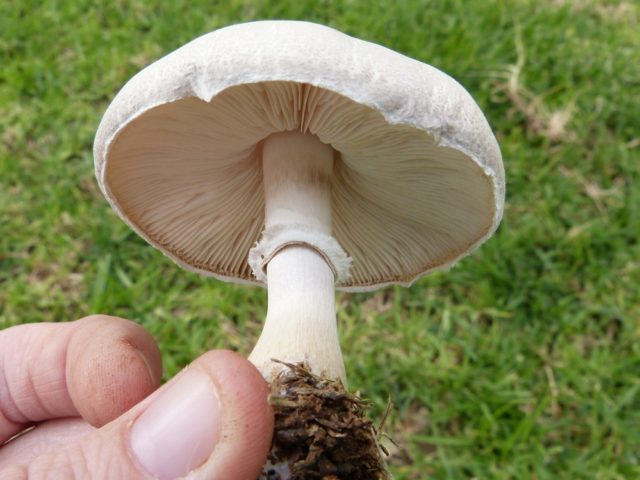 Diese Art von Champignon sieht wunderschön und elegant aus. Auf einem schlanken, schlanken Bein, umgeben von einem weißlichen Ring, steht eine Prostata-Kappe mit einem Durchmesser von 6 bis 10 cm. Bei jungen Pilzen sieht es aus wie eine Glocke, nimmt aber später eine breit konvexe Form mit einem kleinen Tuberkel in der Mitte an. An den Rändern der Kappe können Sie die Reste der Tagesdecke sehen. In den meisten Fällen ist die Kappe dickfleischig, dünnfleischige Exemplare werden selten gefunden.