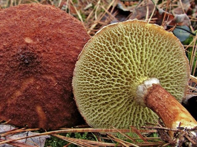 Das Hymenophor dieser Pilze ist schmutzige Olive, große Poren