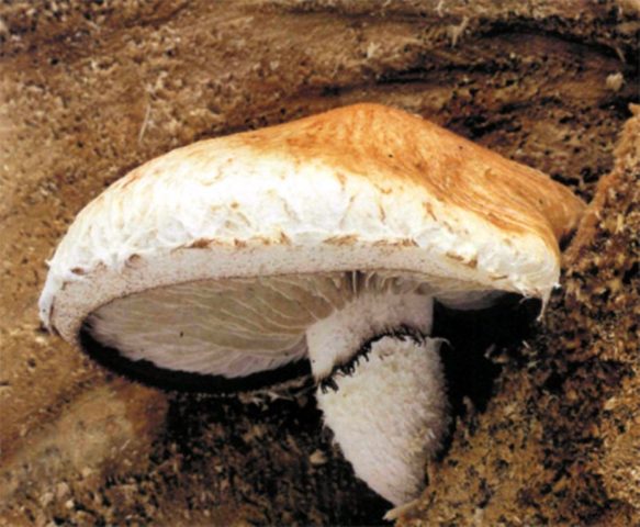 Die hellbraune oder zitronenweiße Oberfläche der Kappe mit einem Durchmesser von 5 bis 7 cm ist vollständig mit zahlreichen cremefarbenen Schuppen bedeckt. Der Hut hat eine halbkugelförmige Form mit gewellten und faserigen Kanten. Das Fruchtfleisch ist dicht, weiß und nimmt mit zunehmendem Alter eine dunkelbraune Farbe an. Der untere Teil ist mit zahlreichen dunklen Platten gekrönt und mit einem dichten Lichtfilm bedeckt, der mit dem Alter des Pilzes bricht und das Bein in Form eines Rings schmückt.