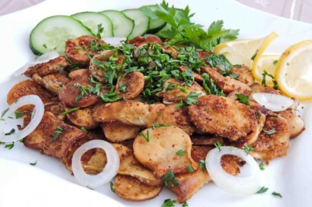 Gebratene Wiesenregenmäntel sind beim Kochen sehr beliebt. Meistens werden sie im Teig gekocht. Auch bei hohen Temperaturen behält der Pilz seine Größe und Struktur. Gemüsesalat ist eine hervorragende Ergänzung zu einem panierten Gericht.