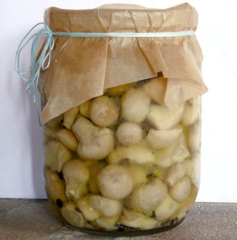 - Pilze werden in sterilisierten Gläsern ausgelegt. Knoblauch darauf legen. Der Inhalt wird bis zum Rand mit Marinade gegossen.