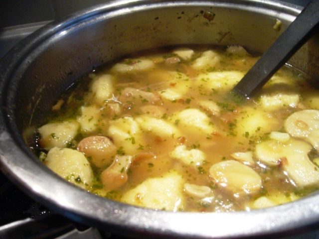 Ein weiteres einfaches Rezept ist Pilzsuppe. Gekochte Regenmäntel sollten in kleine Scheiben geschnitten, leicht in einer Pfanne gebraten und dann mit Zwiebeln und fein gehackten Karotten in die Hühnerbrühe gegeben werden. Kochen Sie die Suppe etwa 10 Minuten lang, bevor Sie sie servieren. Sie können der Brühe auch Erbsen in Dosen und ein wenig Gemüse hinzufügen.