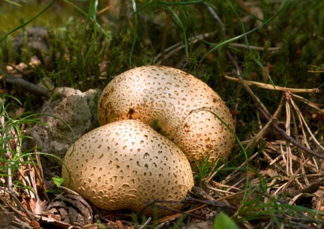 Ein gewöhnlicher oder Zitronen-Pseudo-Regenmantel hat einen ähnlichen ovalen Fruchtkörper von etwa 6 cm Höhe, die Oberfläche des Pilzes ist mit dunklen Schuppen bedeckt. Ein falscher Regenmantel ist nicht für Lebensmittel geeignet, aber es ist recht einfach, ihn von einem essbaren zu unterscheiden - die Farbe einer ungenießbaren Art ist meistens hellbraun oder bräunlich, das Fleisch ist im Schnitt gelb.